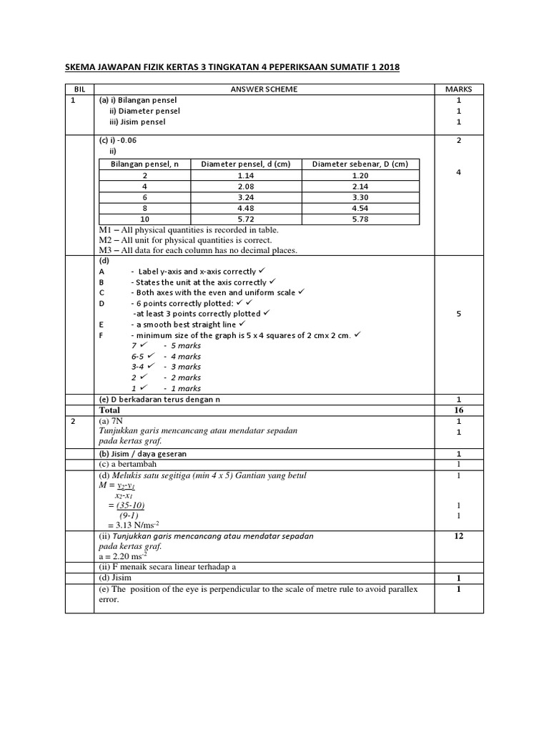 Soalan Percubaan SPM Fizik Terengganu 2018 adalah sebahagian kertas soalan yang telah berjaya dikumpulkan dan dikemaskini oleh GuruBesarmy. 1992019 Koleksi Soalan SPM 2014 Sehingga SPM 2018. SKEMA PERCUBAAN SPM FIZIK 2018 KERTAS 3 1 a i 1 ii 1 iii 1 b 2 c 5 d 5 e 1 TOTAL MARKS 16 No.